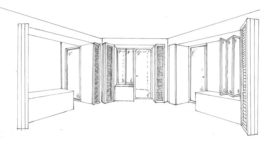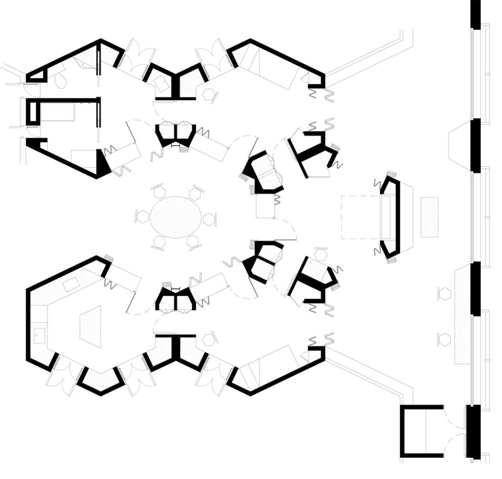 Respecto al alojamiento tipo, se encuentra un hexágono central que actúa como espacio intermedio entre zona pública y privada, compuesta por habitaciones, cocina y lavabo. Al atravesar las estancias nos encontramos con una galería que crea un filtro entre el interior y el exterior. Esta tipología dispone de doble circulación desde el interior o por el exterior, además se ha colonizado el grosor de las paredes con los muebles.