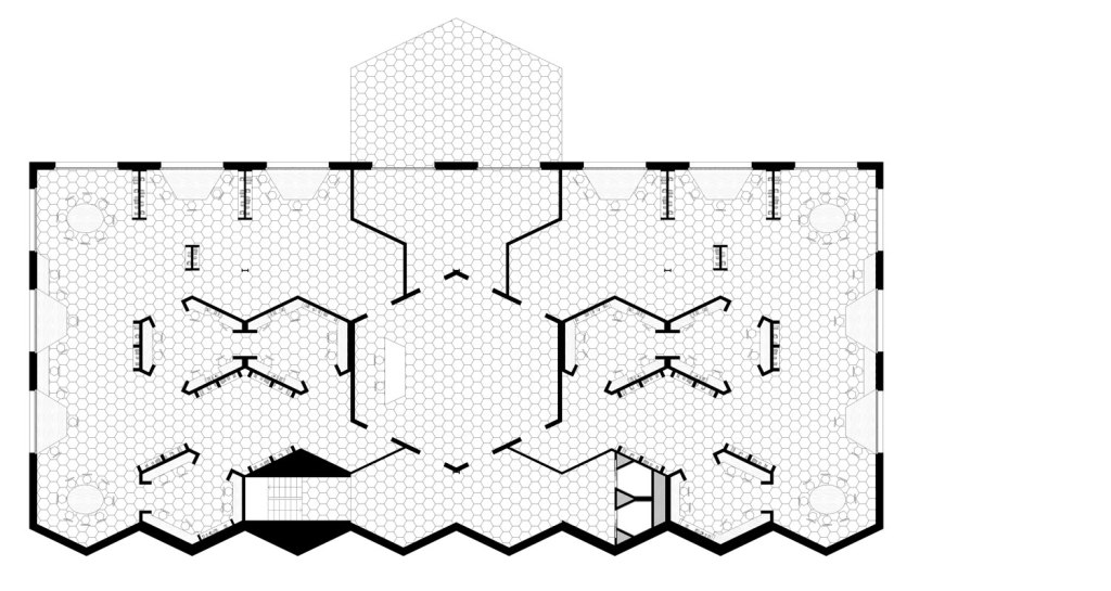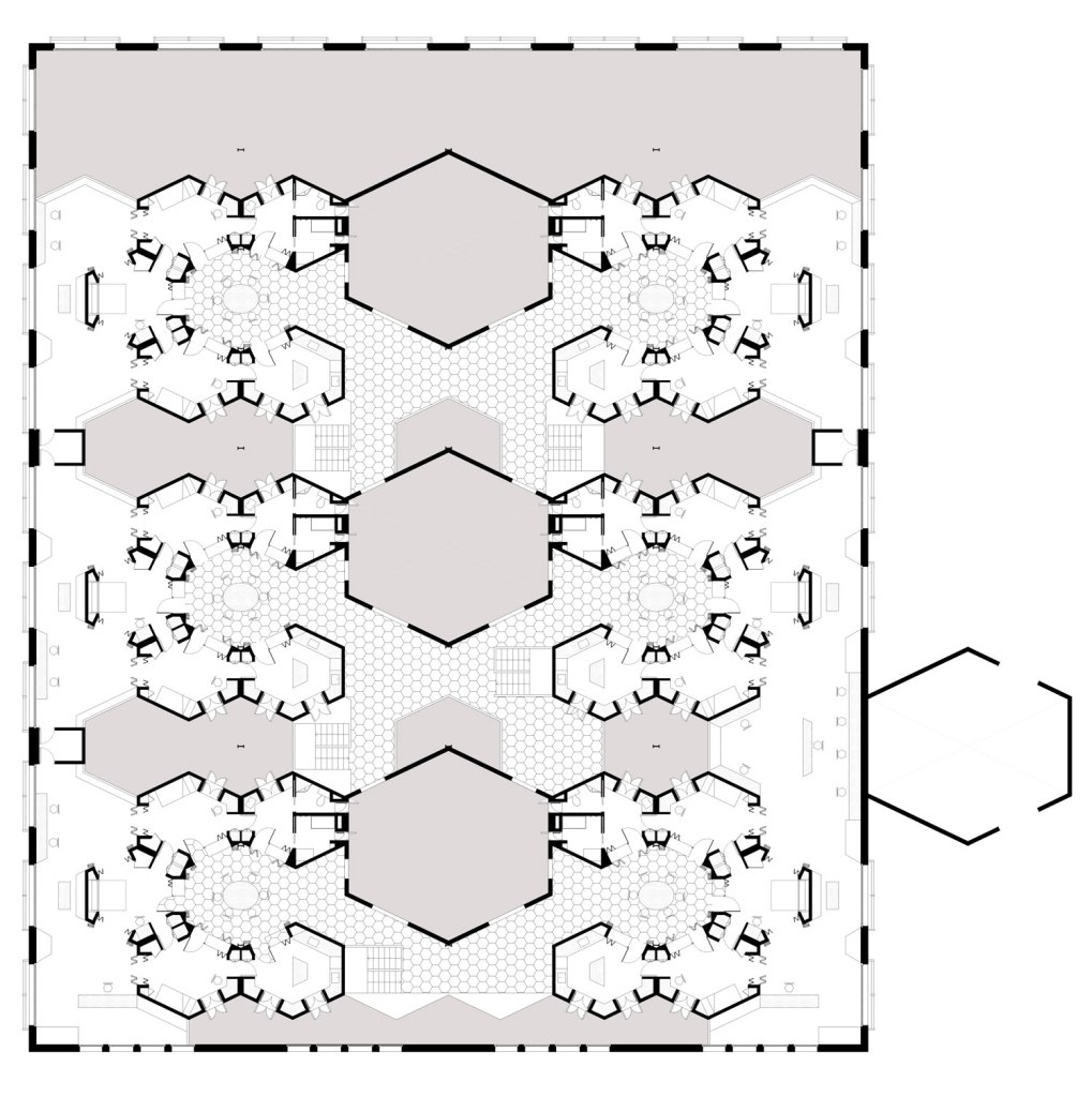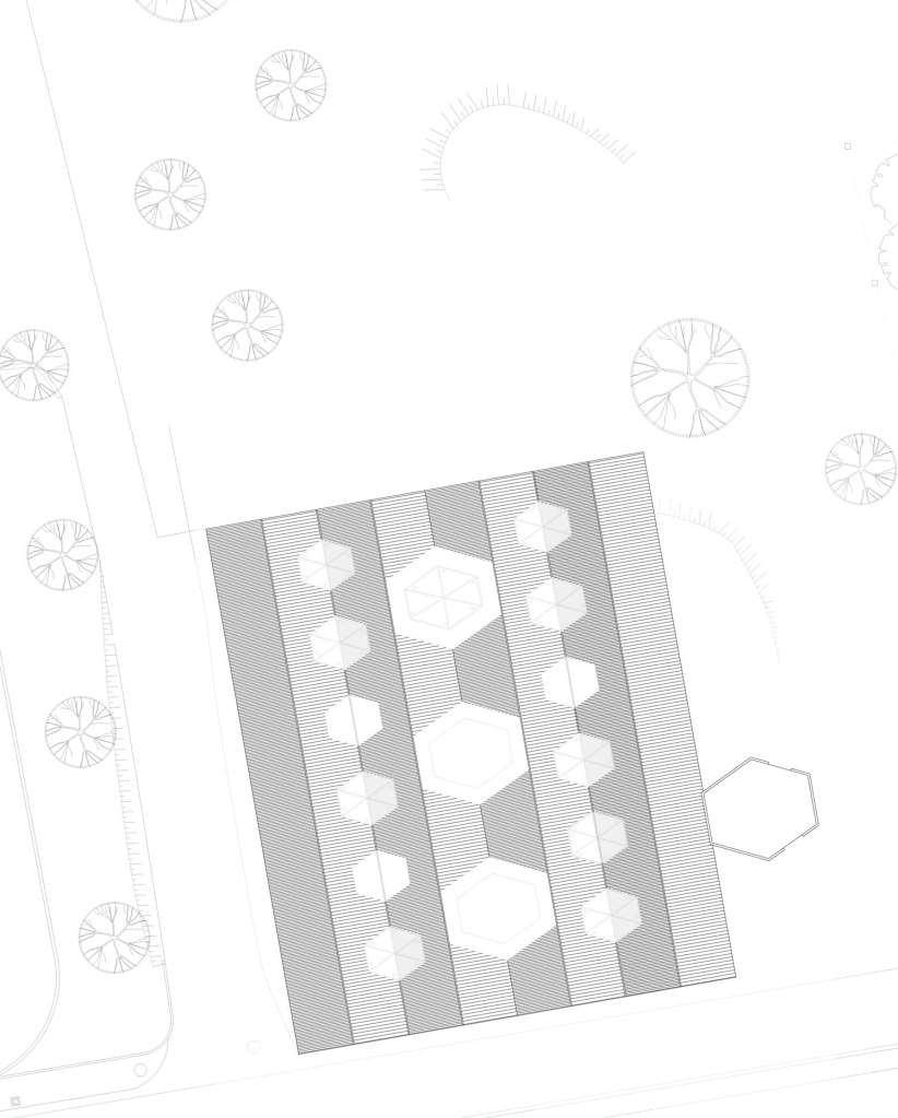 Por jerarquía, tres hexágonos forman los espacios de transición a las viviendas y biblioteca, y otro exterior nos marca la entrada al edificio. Como espacios secundarios tenemos los patios que sitúan entre viviendas y hacen posible la ventilación natural.