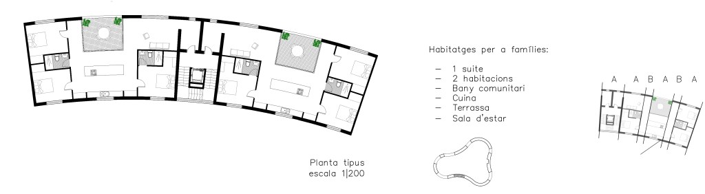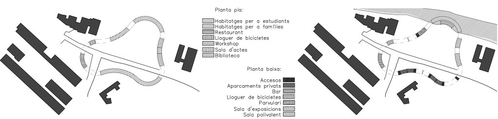 El programa incluye viviendas para familias y estudiantes relacionados con la actividad del parque tecnológico, estos están colocados en las zonas sur y norte respectivamente, determinado según la relación y la desconexión que cada tipología necesita. En las zonas este y oeste se ubican las zonas destinadas a biblioteca, workshop, restaurante, gimnasio y guardería (servicios para los profesionales del campus y de la población).