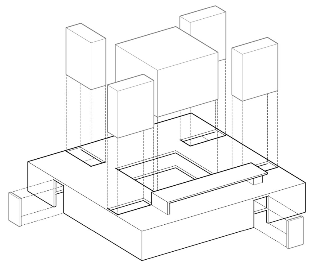 El edificio forma un prisma rectangular, del cual se han extraído otros para la formación de los patios de luz: un patio principal y cuatro secundarios a su alrededor. El acceso principal se ubica en la planta cubierta, al bajar se encuentra la planta para despachos y otros servicios, y donde también se ha ubicado el aula de arquitectura para trabajo libre con un entrada separada para poder disponer del aula en horarios no lectivos.